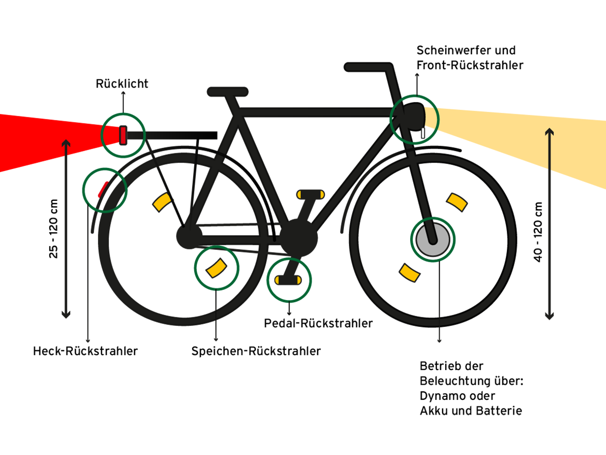 - Mindestens ein rotes Rücklicht, das nicht blinken darf. Eine Bremslichtfunktion ist zulässig.
