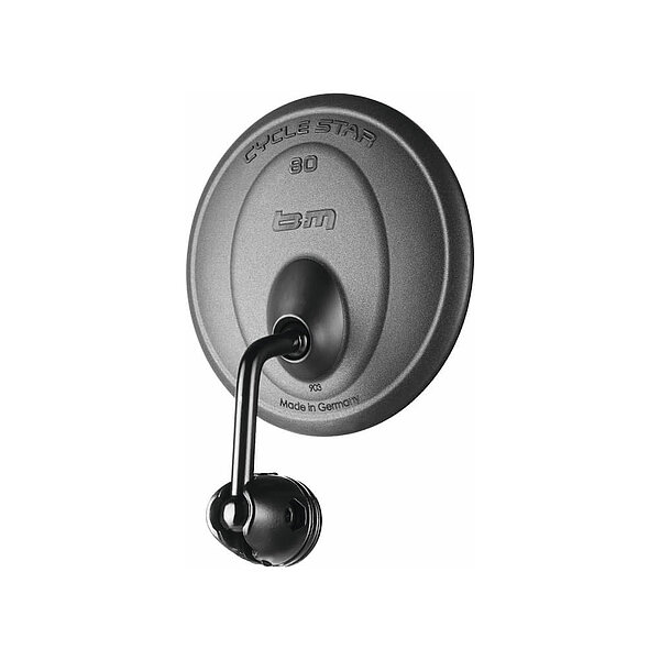 Mit einem Spiegelglasdurchmesser von 80 mm bietet er ein um 75 % größeres Sichtfeld. In der Schweiz zugelassen zur Montage an E-Bikes. Die starke Spiegelwölbung (verkleinerndes Spiegelglas) sorgt für ein super großes Sichtfeld. Das Glas hat einen Splitterschutz. Elegant geformtes Gehäuse aus Kunststoff, extrem verstellbar, einklappbar.