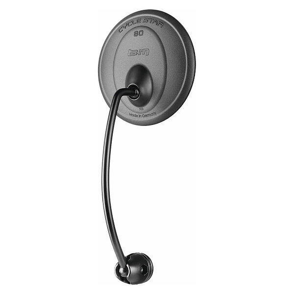 Mit einem Spiegelglasdurchmesser von 80 mm bietet er ein um 75 % größeres Sichtfeld. In der Schweiz zugelassen zur Montage an E-Bikes. Die starke Spiegelwölbung (verkleinderndes Spiegelglas) sorgt für ein super großes Sichtfeld. Das Glas hat einen Splitterschutz. Elegant geformtes Gehäuse aus Kunststoff, extrem verstellbar, einklappbar.