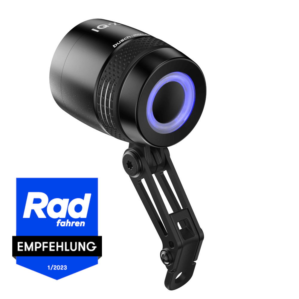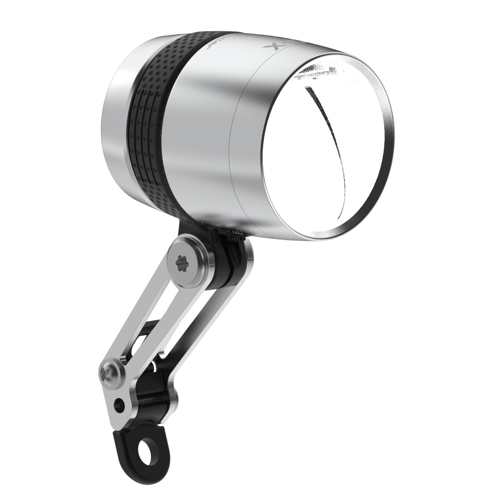 Seine neu entwickelte Lichttechnologie macht es erstmals möglich, mit einem Dynamo-Fahrrad-Frontlicht die 100-Lux-Marke zu knacken – und das mit einer sehr breiten, weiten und homogenen Großflächen-Ausleuchtung der Straße. Zur High-End-Technik gesellt sich beim IQ-X auch Design: Das Gehäuse, das auch als Kühlungssystem dient, besteht aus hochwertigem Aluminium, wahlweise silber oder schwarz. Hell zur Seite abstrahlende Schlitze im Halterring setzen Sichtbarkeits-Akzente, während der ergonomische Bedientaster in einen blau leuchtenden Ring eingebettet ist.