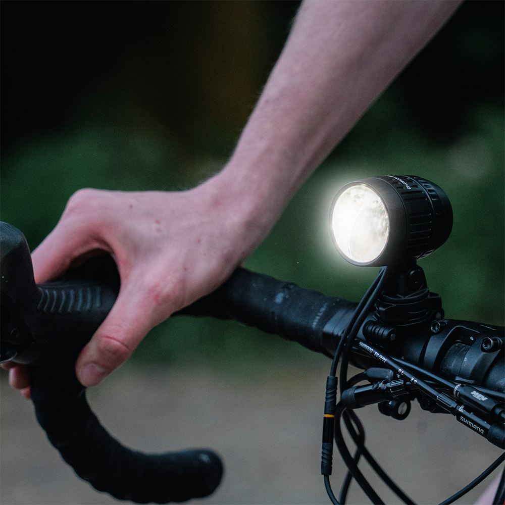 Im Abblendbetrieb verfügt der IQ-XM speed über drei Leuchtstufen von 20 bis 120 Lux. Im Fernlicht-Modus liefert er 170 Lux. 120 Lux in der höchsten Abblendlicht-Stufe (4,5 Std.), 70 Lux in der mittleren Abblendlicht-Stufe (7 Std.), 20 Lux in der niedrigsten Abblendlicht-Stufe (23 Std.), Fernlicht: 170 Lux (90 Min.). Das Akkupack liefert 4.600 mAh und wird per praktischem Klettband am Fahrradrahmen befestigt. Fünf blaue LEDs am Akku zeigen den Ladestand, wobei eine LED jeweils 20 % Kapazität repräsentiert. Mit stabilem Drehrast-Lenkerhalter für alle runden Lenkertypen von 22 bis 32 mm Durchmesser.
