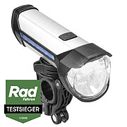Ein besonderer Blickfang ist die praktische Ladestandanzeige mit je fünf seitlichen LEDs an der linken und rechten Fahrrad-Frontlichtseite, die sich perfekt in das Design einfügen. Ist der Akku fast leer, leuchtet zusätzlich eine rote LED im Taster auf. Das Fahrrad-Frontlicht wird dank Schnellladefunktion per USB in drei Stunden zu 100 % geladen. Praktisch: 1.500 mAh können unterwegs als Powerbank genutzt werden, um USB-Mobilgeräte zu laden oder zu betreiben.