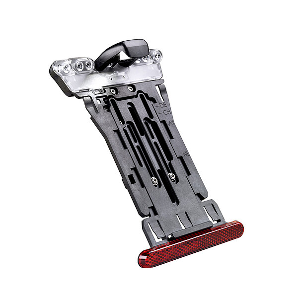 Kennzeichenhaltersystem, bestehend aus Halter, Rücklicht mit Bremslicht, Kennzeichenbeleuchtung, Rückstrahler. Halter verstellbar, passend für Kennzeichen aus DE, NL, A, CH. Alle Beleuchtungskomponenten mit E-Prüfzeichen