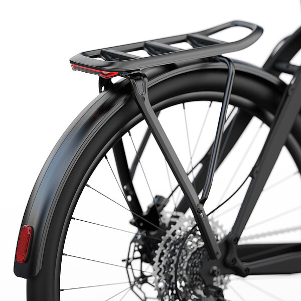 Das E-Bike-Rücklicht für die Montage an schmalen Gepäckträgern überzeugt durch Design und Leistung. Die Form schließt harmonisch an den Seiten des Gepäckträgers ab.