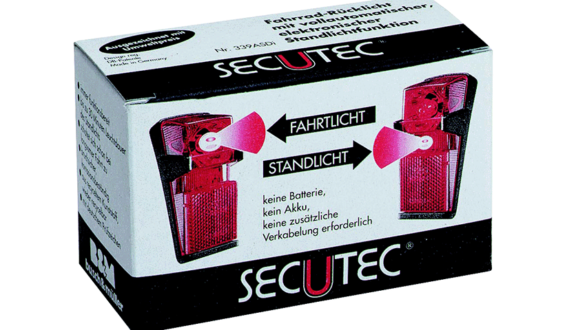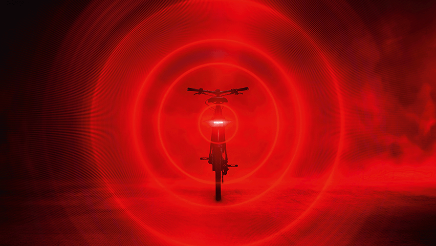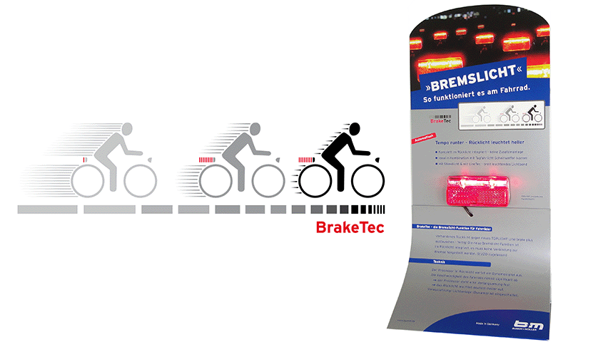 Als Erweiterung für das bewährte Bremslicht-Rücklicht entwickelten wir eine Notbremslichtfunktion, die bei besonders starken Bremsvorgängen intensiver aufleuchtet und blinkt – und so nachfolgende Verkehrsteilnehmer warnt. Auch diese Erfindung wurde in eine deutsche Vorschrift (TA) aufgenommen und ist jetzt Standard in der Fahrradwelt.