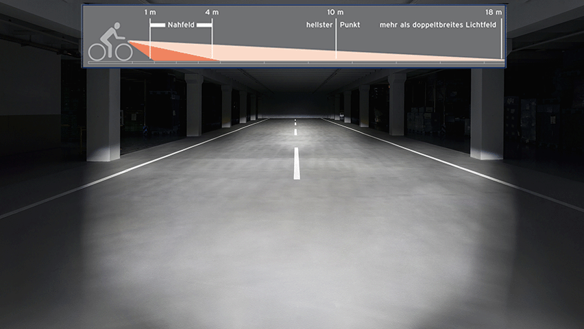 Mit Nahfeldausleuchtung beginnt der ausgeleuchtete Bereich bei Scheinwerfern schon 1 Meter vor dem Fahrrad. Das ermöglicht es, auch nachts auf kleine Unebenheiten oder Hindernisse unmittelbar vor dem Vorderrad zu reagieren. Begriff und Technologie stammen aus unserer Ideenschmiede und sind heute Standard in der Branche.