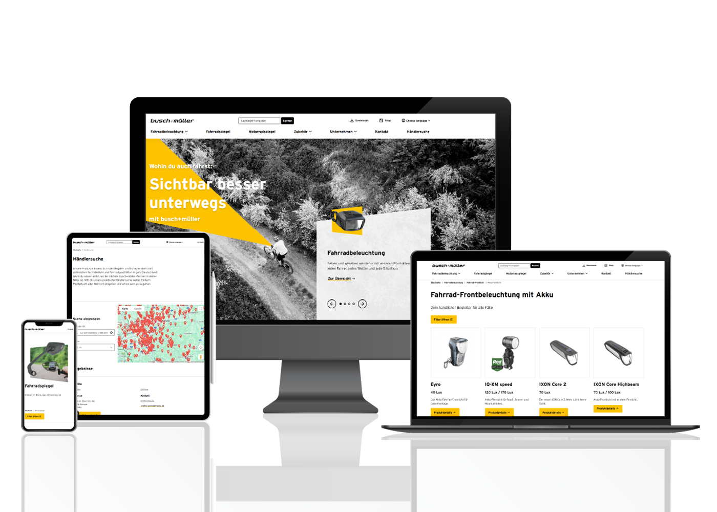 Bereits zur Eurobike im Juni zeigte sich das neue Corporate Design erstmals der Öffentlichkeit: kraftvoll, eigenständig und mit einer unverwechselbaren Tonalität, die für hohe Wiedererkennbarkeit sorgt. Die neue Website führt diesen Ansatz konsequent fort. Sie inszeniert die marktprägenden Originale von busch+müller ebenso wie die hohe Relevanz der Produkte im Alltag aller Zweiradfahrer.