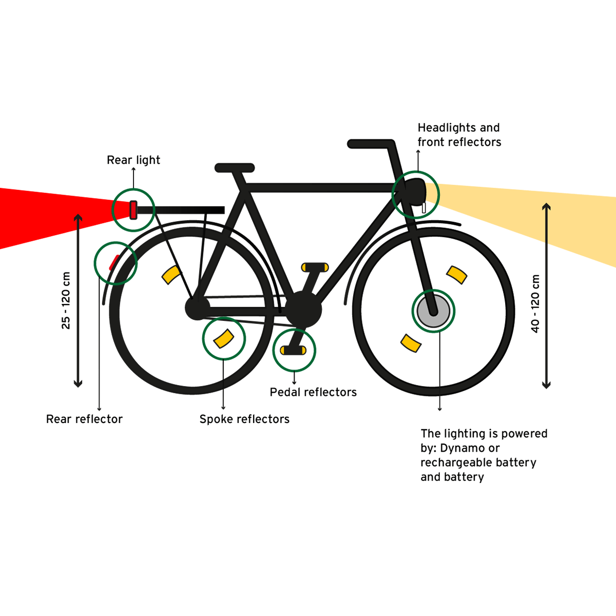 Front lights must be mounted at a height between 40 and 120 cm. - Two front headlights are required for bicycles with a width of one meter or more (e.g., cargo bikes).