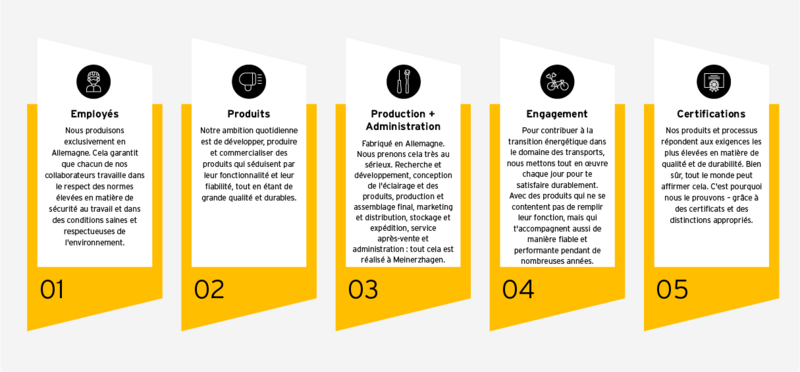 Faire du vélo est bon pour la santé, l'environnement et soulage les villes du trafic automobile - plus de raisons qu'il n'en faut pour enfourcher régulièrement son vélo. Nos solutions d'éclairage te permettent d'être plus visible sur la route, surtout au crépuscule et dans l'obscurité. C'est pourquoi nous nous efforçons jour après jour de t'enthousiasmer durablement, afin de contribuer au tournant souhaité dans le domaine des transports. Avec des produits qui ne remplissent pas seulement leur fonction, mais qui sont aussi des compagnons solides et fiables pendant des années.